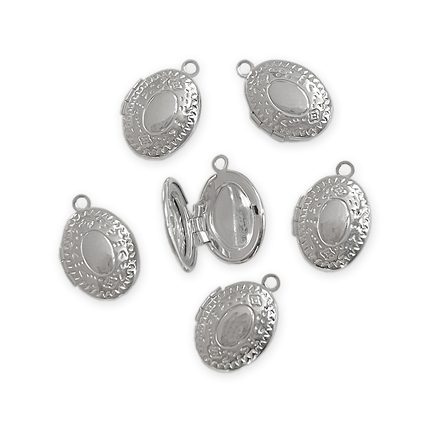 4 tiny silver colour oval lockets, measuring around 15mm tall x 10mm wide.